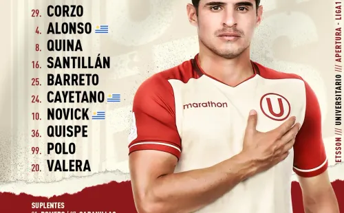 “¡Alineación titular! Así formaremos ante Alianza Lima en el Estadio Monumental”. Pasando a presentar después la gráfica donde se ve una gran novedad: José Carvallo; Aldo Corzo, Federico Alonso, Nelinho Quina, Iván Santillán; Gerson Barreto, Ángel Cayetano, Piero Quispe, Hernán Novick, Andy Polo y Alex Valera. Mencionó en su cuenta principal de Twitter.