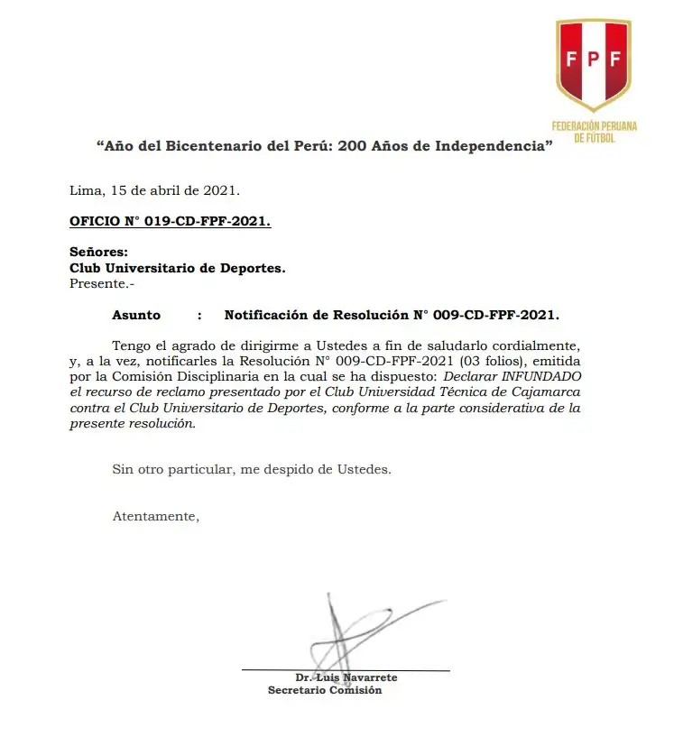 En entrevista a Ovación, el gerente de UTC, Albert Cabanillas indicó:”UTC fue notificado ayer en la tarde-noche. Parece que la resolución ha estado lista desde el 12 de abril. Eso nos lleva a una falta de imparcialidad y transparencia de la Comisión Disciplinaria”.