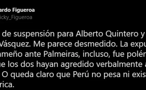 Así lo explica también el periodista deportivo peruano, Ricardo Figueroa: “La expulsión del panameño ante Palmeiras, incluso, fue polémica. Salvo que los dos hayan agredido verbalmente a los árbitros. O queda claro que Perú no pesa ni existe en Sudamérica”. Ambos son dos puntos válidos, porque lo normal hubiese sido que tenga solamente un duelo de sanción. Y desde ‘Ate’ no existió hasta el día de hoy un reclamo por este hecho.