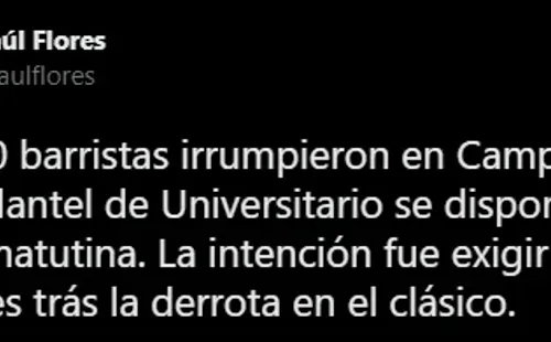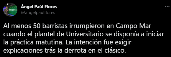 A esto se le suma lo dicho anteriormente por el periodista de Willax Deportes, Ángel Flores:“Al menos 50 barristas irrumpieron en Campo Mar cuando el plantel de Universitario se disponía a iniciar la práctica matutina. La intención fue exigir explicaciones trás la derrota en el clásico”.