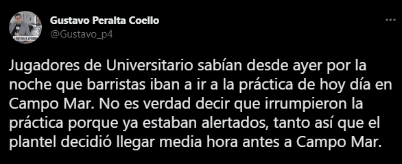 Y finalmente, pero dándole otro ángulo a los hechos supuestamente concretados. Gustavo Peralta entregó un dato relevante desconocido: “Jugadores de Universitario sabían desde ayer por la noche que barristas iban a ir a la práctica de hoy día en Campo Mar. No es verdad decir que irrumpieron la práctica porque ya estaban alertados, tanto así que el plantel decidió llegar media hora antes a Campo Mar”. En las próximas horas irán apareciendo mayores detalles, seguramente. Situación muy complicada.