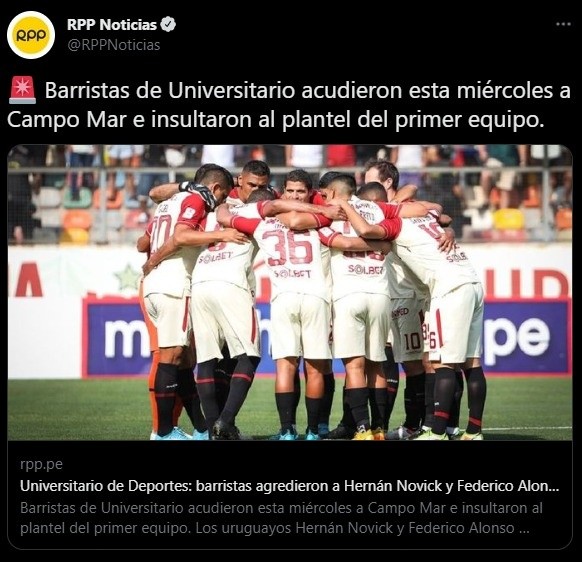 Una agresión es lo que informó ‘RPP Noticias’ en su portal web con información clasificada y exclusiva: “Barristas de Universitario acudieron este miércoles a Campo Mar e insultaron al plantel del primer equipo”. Tituló en su cuenta de Twitter para presentar el siguiente artículo.