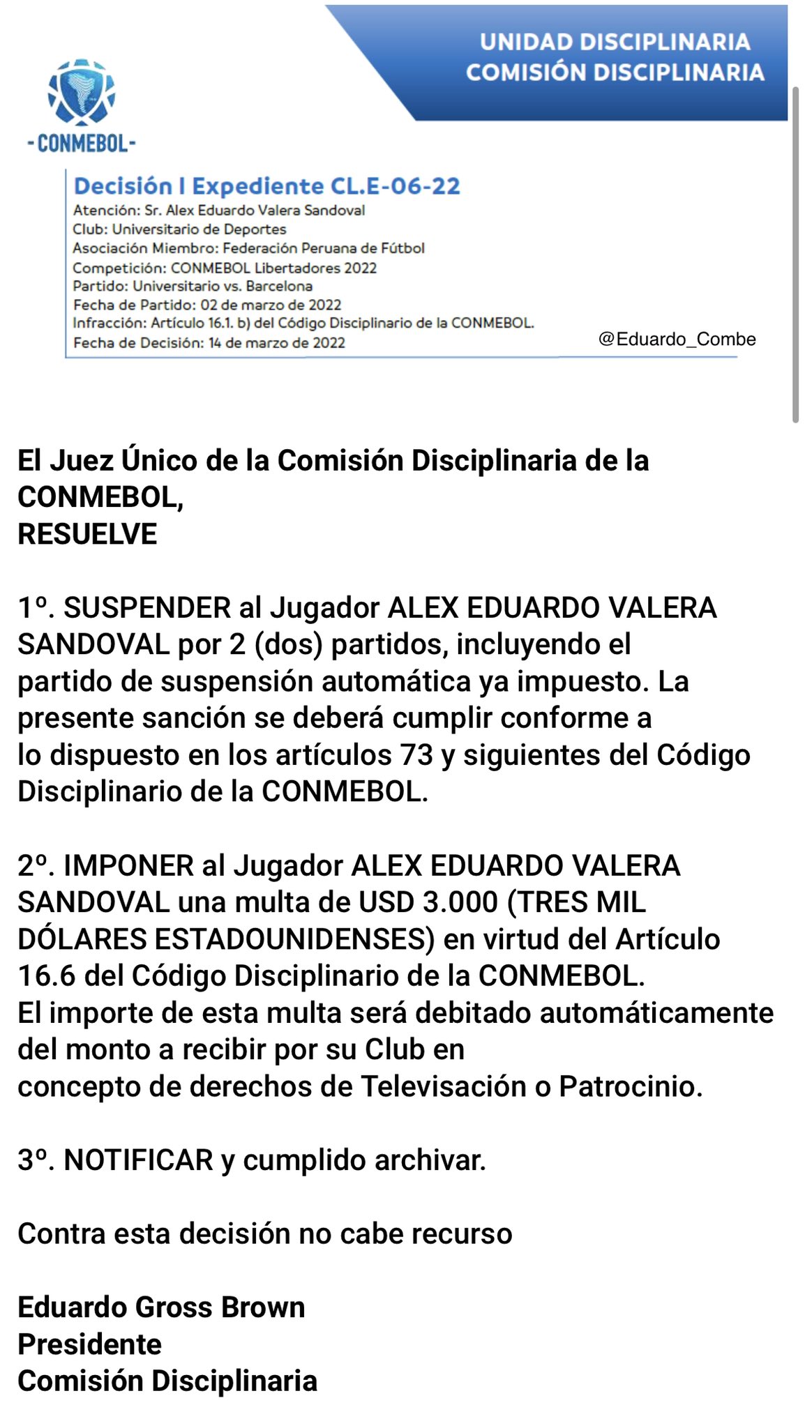El periodista deportivo de ‘América Deportes’, Eduardo Combe, publicó en su Twitter la imagen que referencia todo lo comentado, líneas arriba: “Alex Valera fue suspendido por dos fechas tras su roja ante Barcelona”. Donde ve que el implicado también estará siendo multado por una suma considerable de 3000 dólares en virtud del ‘Artículo 16.6 del Código Disciplinario de la CONMEBOL’.