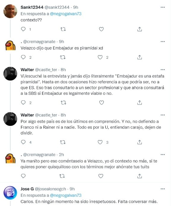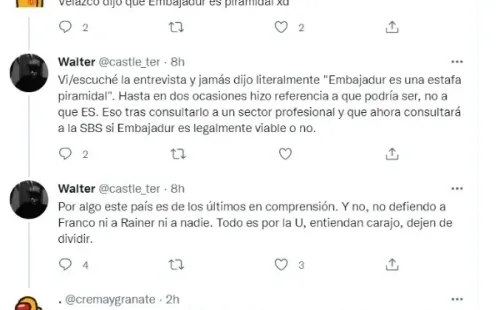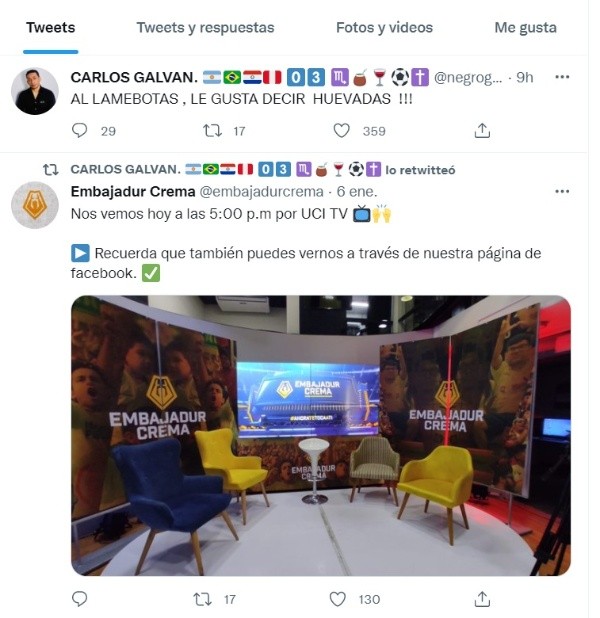“Al Lamebotas, le gusta decir huevadas”, fue lo que publicó el exdefensor en su cuenta de Twitter, tras las declaraciones por el abogado de Universitario de Deportes. Esto generó mucha polémica en las redes del ‘Negro’, ya que los hinchas comenzaron a comentar en la publicación, dando distintas opiniones sobre el tema.