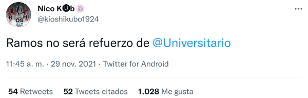 Un periodista vinculado con el club, de hecho, adelanto una información que habría sido causado por esto. “Ramos no será refuerzo de Universitario”, escribió Nico Kubo, que también es periodista de Pulso Sports. Todo esto habría causado su sola presencia en el Nacional ¡Increíble!