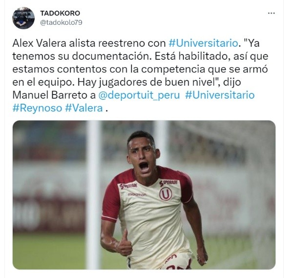 Si bien las declaraciones son recogidas por el diario Depor, el medio deportivo publicó comentarios de Manuel Barreto, actual gerente deportivo de Universitario de Deportes. El dirigente fue claro al mencionar que Alex Valera ya tiene luz verde.