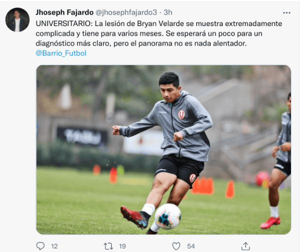 “La lesión de Bryan Velarde se muestra extremadamente complicada y tiene para varios meses. Se esperará un poco para un diagnóstico más claro, pero el panorama no es nada alentador”, escribió Jhoseph Fajardo de Barrio Fútbol. Así, la U tiene su primer sentido y primera posible baja ¡Lamentable!