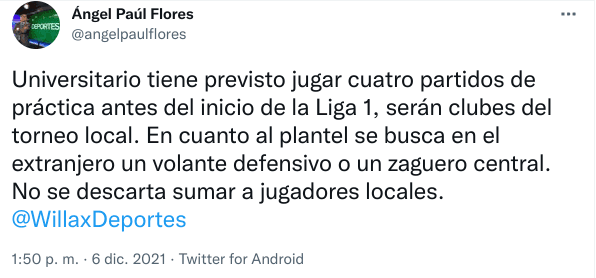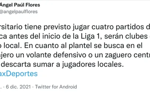 “Universitario tiene previsto jugar cuatro partidos de práctica antes del inicio de la Liga 1, serán clubes del torneo local. En cuanto al plantel se busca en el extranjero un volante defensivo o un zaguero central. No se descarta sumar a jugadores locales”, informó el mencionado comunicador.