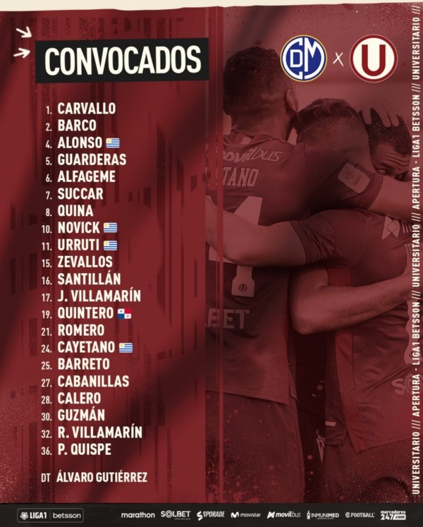 De esta forma, y de no darse ningún cambio de último minuto, el plantel de Ángel Gutiérrez saldrá de la siguiente manera ante Deportivo Municipal. Con José Carvallo en el arco; Roberto Villamarín, Federico Alonso, Nelinho Quina y Nelson Cabanillas en la defensa; Ángel Cayetano, Gerson Barreto, Piero Quispe y Alberto Quintero en el mediocampo y Luis Urruti junto a Alexander Succar en la delantera.