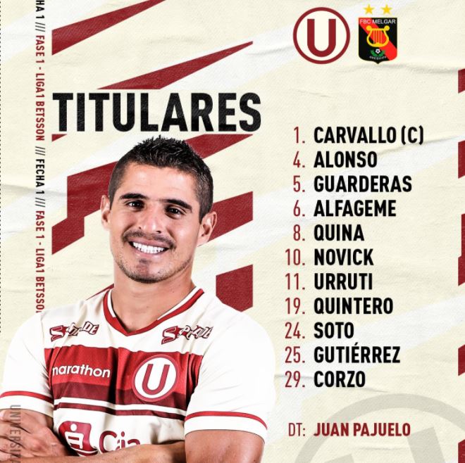 Los titulares de la U en su debut en la Liga ante Melgar el sábado 13 de marzo, son: José: Carvallo; Aldo Corzo, Nelinho Quina, Federico Alonso, José Soto; Armando Alfageme, Rafael Guarderas, Alberto Quintero, Luis Urruti, Hernán Novick y como único delantero Enzo Gutiérrez.