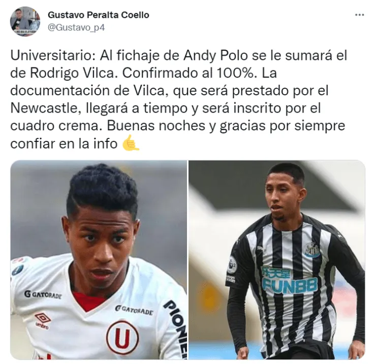 “Al fichaje de Andy Polo se le sumará el de Rodrigo Vilca. Confirmado al 100%. La documentación de Vilca, que será prestado por el Newcastle, llegará a tiempo y será inscrito por el cuadro crema”, reveló el reconocido periodista de ESPN.