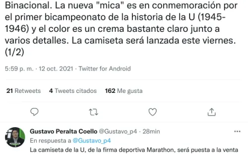 “El cuadro crema estrenará camiseta ante Binacional. La nueva “mica” es en conmemoración por el primer bicampeonato de la historia de la U (1945-1946) y el color es un crema bastante claro junto a varios detalles. La camiseta será lanzada este viernes”, detalló el siempre pendiente de Universitario Gustavo Peralta.