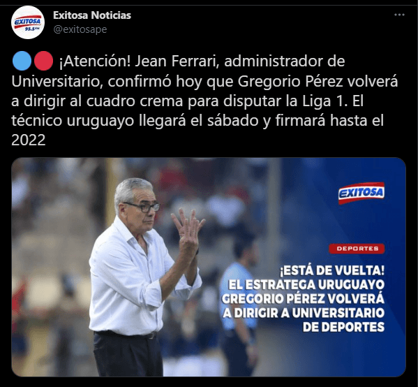 Era prácticamente evidente que se iba a dar, hasta que el mismo Jean Ferrari lo anunció. Gregorio Pérez nuevamente será el entrenador de Universitario de Deportes en lo que resta de la temporada. El técnico uruguayo con historia en el cuadro ‘merengue’ está de regreso, después de que se hable mucho sobre su salida la temporada pasada.