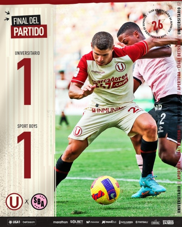 Viviendo un interesante cotejo por la jornada 11 del Torneo Apertura de la Liga 1, Universitario de Deportes no pudo ante Sport Boys en el estadio Monumental. Dirigidos por primera vez por el entrenador Jorge Araujo, los cremas abrieron el marcador gracias a un tanto de Alex Valera, pero igualó Jostin Alarcón.