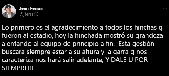 “Lo primero es el agradecimiento a todos los hinchas que fueron al estadio, hoy la hinchada mostró su grandeza alentando al equipo de principio a fin. Esta gestión buscará siempre estar a su altura y la garra que nos caracteriza nos hará salir adelante ¡¡¡Y DALE U POR SIEMPRE!!!”. Fue lo que comentó Jean Ferrari, recibiendo críticas de todos los colores.