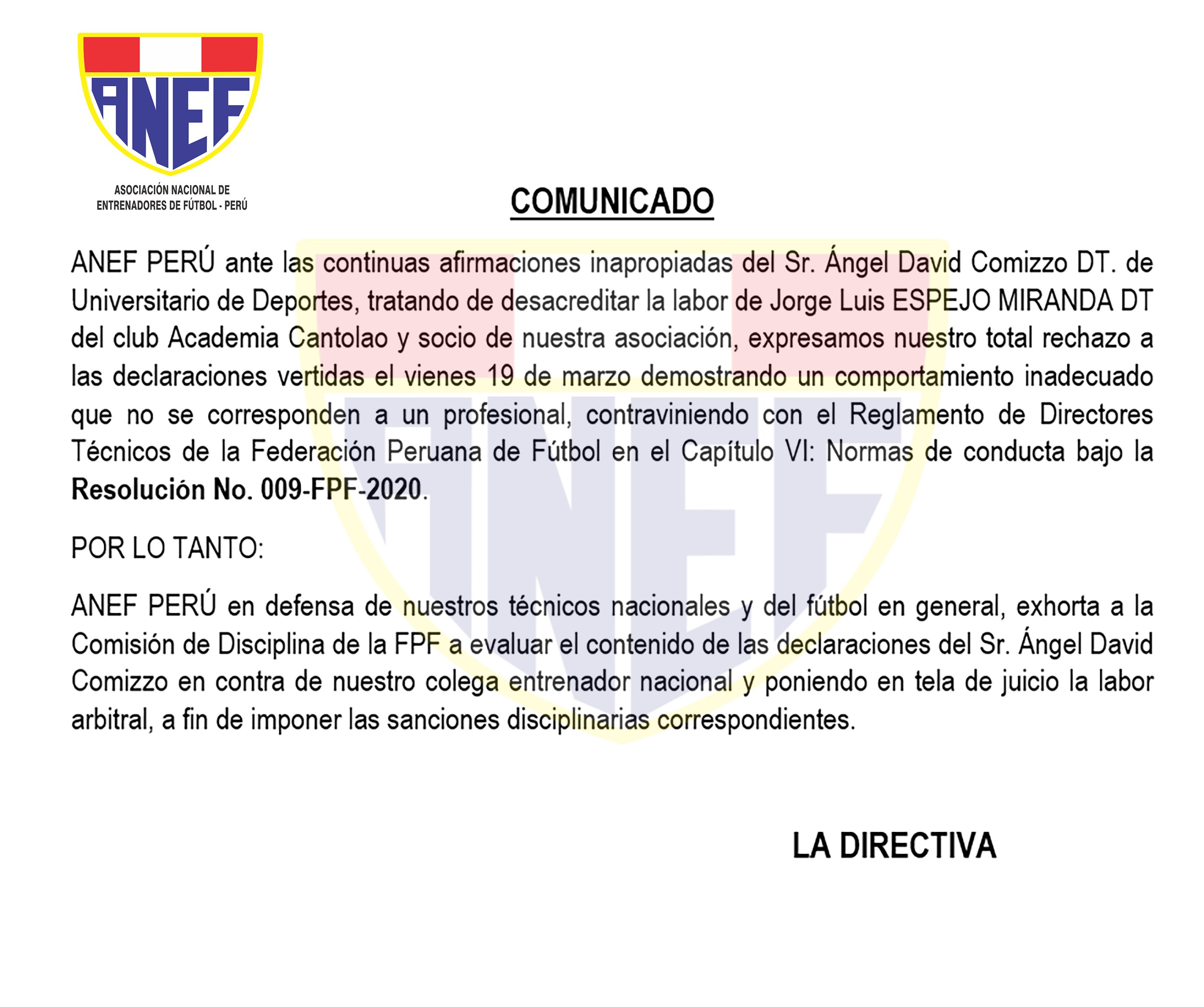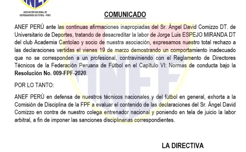 “Declarar persona no grata al DT Ángel Comizzo es lo menos que podemos hacer para un elemento que viene comportándose como un delincuente. Este tipo de entrenadores no los queremos en nuestro fútbol”, señaló el Presidente Hernán Saavedra.