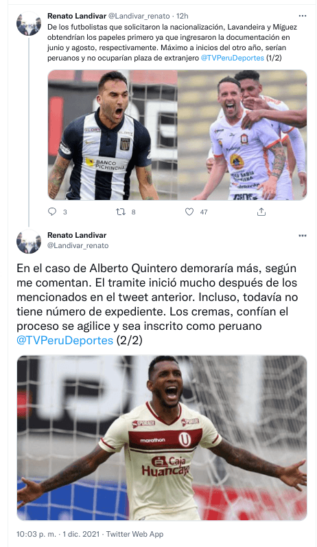 “El caso de Alberto Quintero demoraría más, según me comentan. El tramite inició mucho después de los mencionados en el tweet anterior. Incluso, todavía no tiene número de expediente. Los cremas, confían el proceso se agilice y sea inscrito como peruano”, señaló el mencionado comunicador.