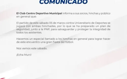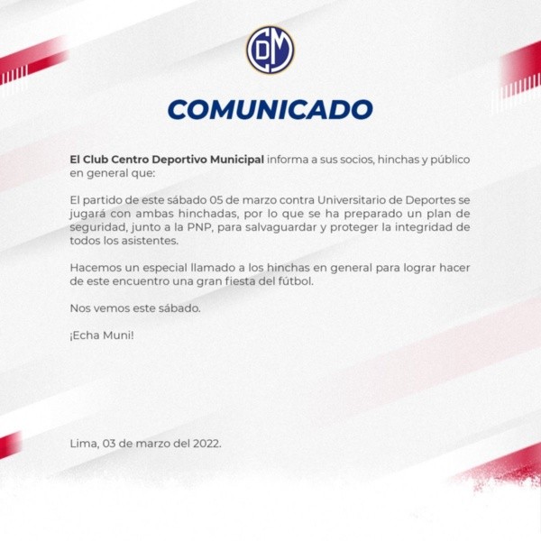 Mediante un comunicado oficial, ‘La Franja’ en sus redes sociales colgó el siguiente mensaje: “El partido de este sábado 5 de marzo contra Universitario de Deportes se jugará con ambas hinchadas, por lo que se ha preparado un plan de seguridad, junto a la PNP, para salvaguardar y proteger la integridad de todos los asistentes”.