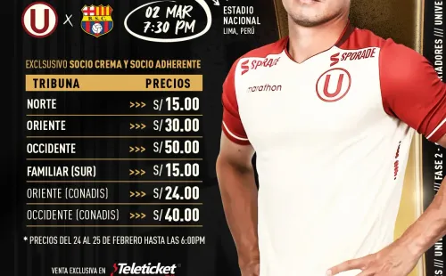 La tribuna norte tiene el valor de 15 soles, al igual que la de sur (familiar), oriente cuenta con dos precios, el de 30 soles y de 24 que sería para CONADIS. Finalmente los asientos de occidente están costando 50 soles y a 40 por ser del Consejo Nacional para la Integración de la Persona con Discapacidad. Al finalizar las fechas indicadas saldrá el costo al público en general hinchas de Universitario de Deportes.