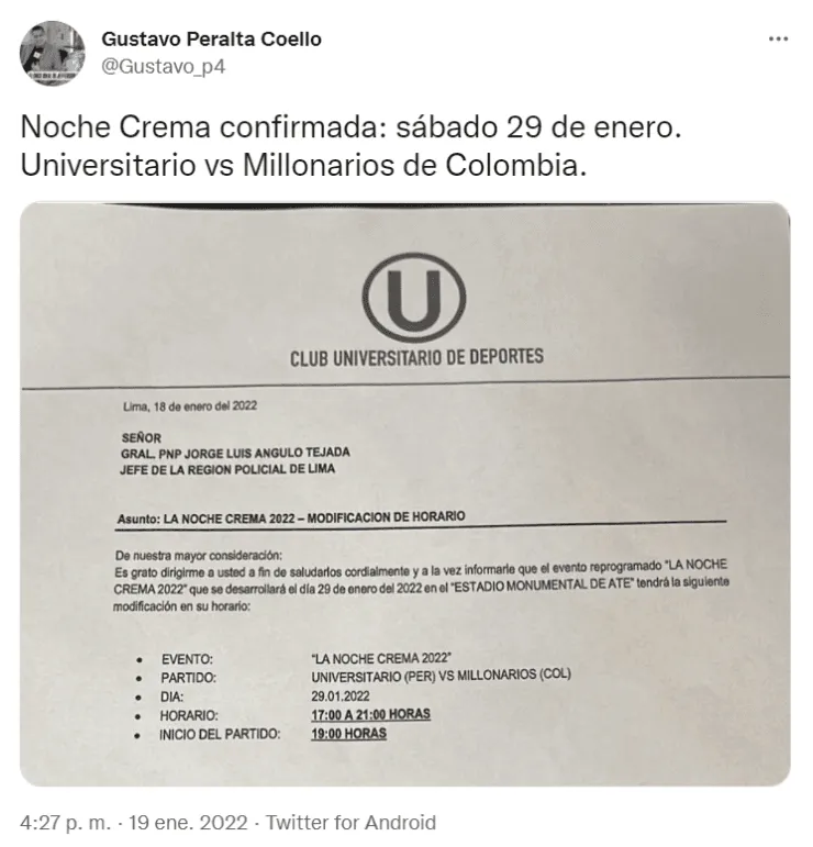 “Noche Crema confirmada el sábado 29 de enero. Universitario vs Millonarios de Colombia”, fue el mensaje que publicó el periodista Gustavo Peralta, acompañado de una fotografía del documento que confirmaría la realización de la presentación oficial del plantel 2022 del club merengue.
