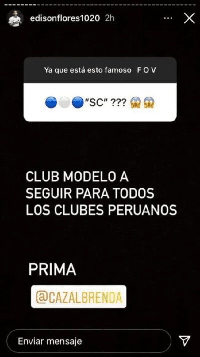 “Club modelo a seguir para todos los clubes peruanos”, señaló Flores en una de sus historias en su cuenta de Instagram.