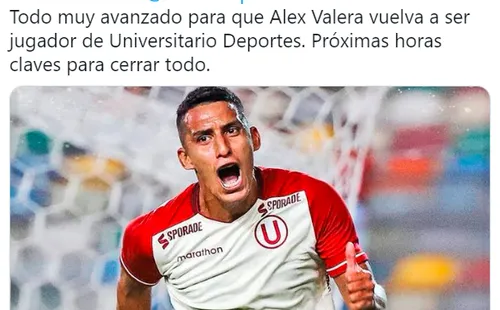 “Todo muy avanzado para que Alex Valera vuelva a ser jugador deUniversitario Deportes. Próximas horas claves para cerrar todo”, publicó el comunicador.