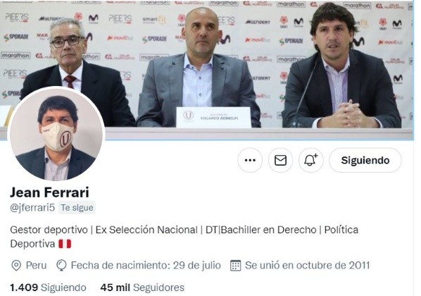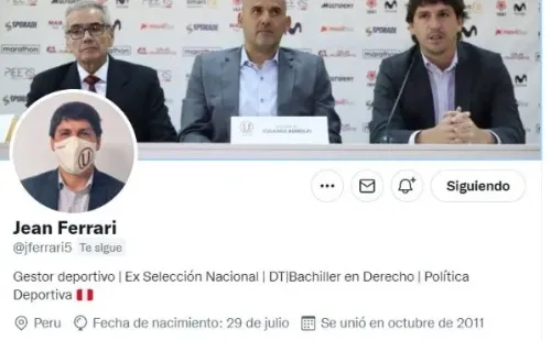 Como se sabe, Jean Ferrari es muy activo en Twitter, y el pasado jueves 26 de agosto cambio su foto de perfil, donde los hinchas del equipo ‘crema’ le comentaron con apoyos y muchas buenas vibras al nuevo administrador del conjunto que dirige Juan Pajuelo como director técnico interino en este 2021.
