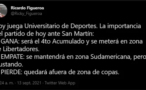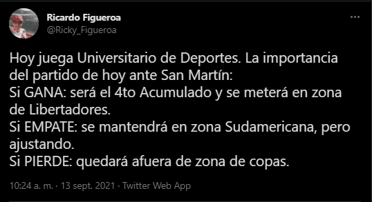 Así lo hace recordar el periodista Ricardo Figueroa, quien en su cuenta de Twitter menciona un tema para tomar en cuenta. Universitario de Deportes hoy estará jugándose ante San Martín una parte importante de la temporada, así como lo leen. Porque ‘los merengues’ no están cómodos dentro de la tabla acumulada, la que finalmente te coloca en torneos internacionales.
