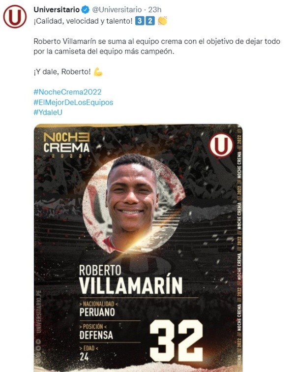Universitario de Deportes oficializó una nueva contratación para lo que viene en la temporada 2022, donde los ‘cremas’ afrontarán la Liga 1 y la fase previa de la Copa Libertadores. De esta forma,Roberto Villamarín se sumó al conjunto de Ate. Este futbolista ocupa la posición de lateral derecho, por lo que será una competencia sana para Aldo Corzo, quien acaba de ser elegido por Conmebol como el mejor lateral derecho de la jornada 15 en las Eliminatorias Sudamericanas.