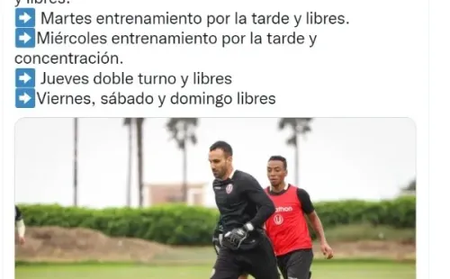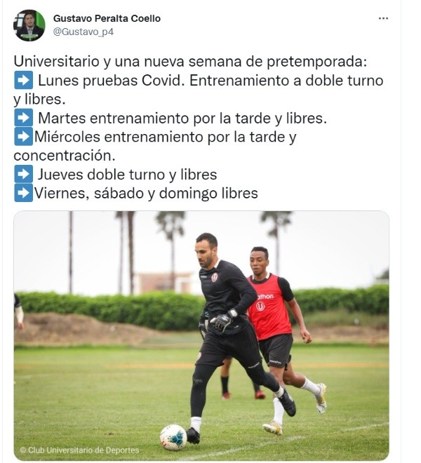 Así pues, y resumiendo la semana de actividades que tendrá Universitario de Deportes, el periodista Gustavo Peralta comentó que este lunes los cremas tendrán entrenamiento a doble turno, el miércoles también se ejercitarán a doble turno y luego concentrarán. El jueves otra vez ejercicios a doble turno y viernes, sábado y domingo libre.