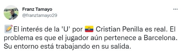 Es por ese motivo que en Universitario de Deportes estarían interesados en la contratación del extremo por izquierda, Cristian Penilla. El problema es que el futbolista aun pertenece al Barcelona de Ecuador, por lo que su entorno viene trabajando en la salida del club inmediata para así poder negociar con los ‘Merengues’ y llegue a la Liga 1.