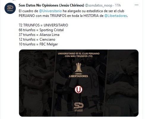 Sumaron 285 puntos y se pusieron a más de 30 de Sporting Cristal (254) que juega este miércoles. Alianza Lima, a pesar de sus participaciones, solo tiene 142 unidades. Gracias a Son datos no opiniones también se vio que son el equipo peruano más ganador en este torneo con 72 triunfos.