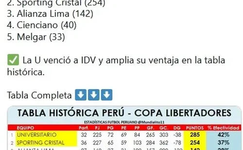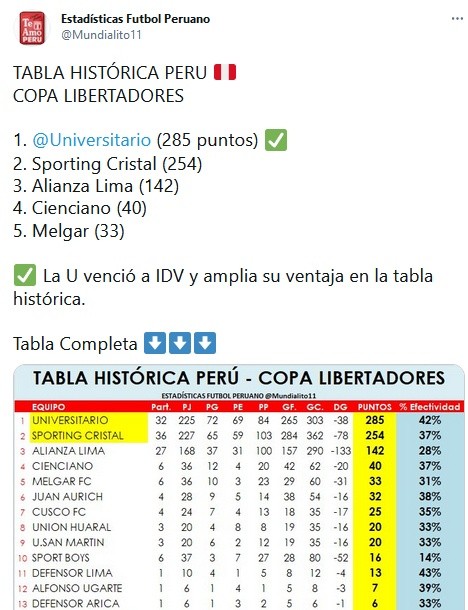 Con esto, no solo confirmaron su grandeza, sino también su rendimiento histórico en la Copa Libertadores. Sumaron tres puntos en la tabla histórica del torneo, en el que son el mejor peruano ubicado.