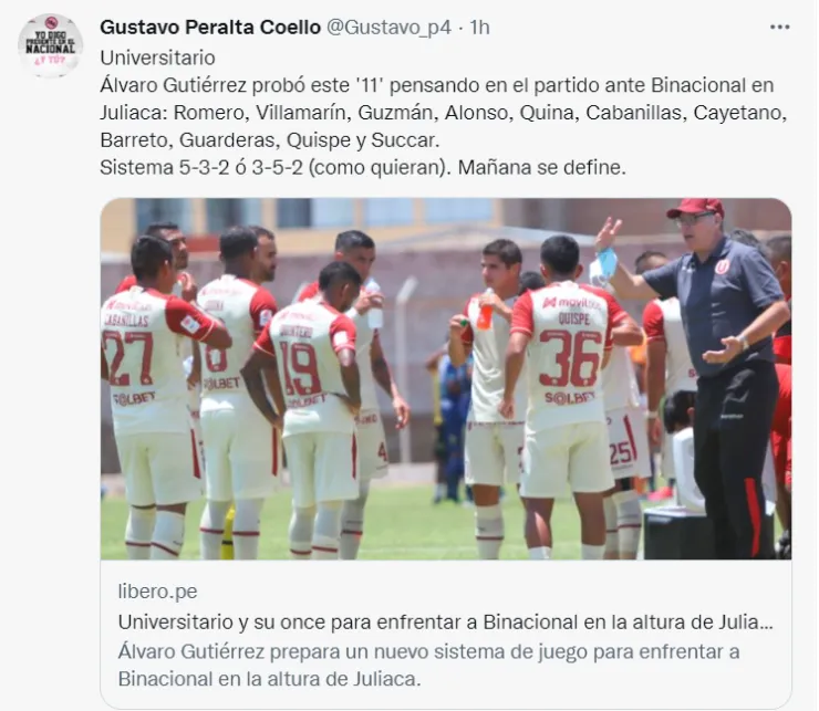 “Universitario Álvaro Gutiérrez probó este ’11’ pensando en el partido ante Binacional en Juliaca: Romero, Villamarín, Guzmán, Alonso, Quina, Cabanillas, Cayetano, Barreto, Guarderas, Quispe y Succar. Sistema 5-3-2 o3-5-2 (como quieran)”, fue el mensaje publicado por el periodista Gustavo Peralta en su cuenta de Twitter.