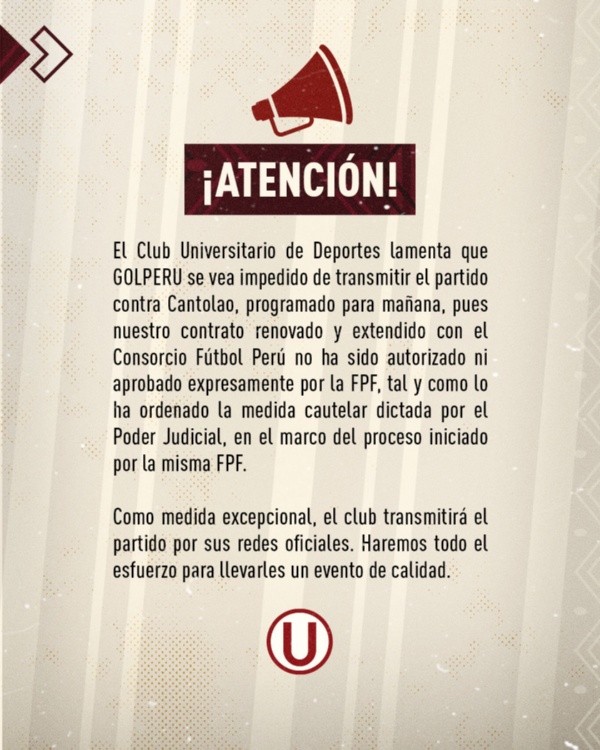 “Como medida excepcional, el club Universitario de Deportes transmitirá el partido por sus redes sociales. Haremos todo el esfuerzo para llevarles un evento de calidad”, aseguró Universitario de Deportes a través de sus redes sociales.