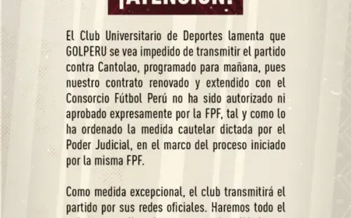 Ante esto, la gran duda cayó sobre por qué señal será transmitido el partido. Teniendo los derechos el Consorcio Fútbol Perú, en horas de la noche de este viernes 3 de febrero, Universitario de Deportes emitió un amplio comunicado de prensa.