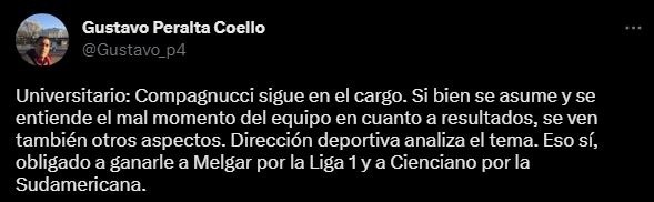 “Universitario: Compagnucci sigue en el cargo. Si bien se asume y se entiende el mal momento del equipo en cuanto a resultados, se ven también otros aspectos. La dirección deportiva analiza el tema. Eso sí, obligado a ganarle a Melgar por la Liga 1 y a Cienciano por la Sudamericana”. ¿Llegará hasta esa jornada o es mucho pedir? Por ahora, todo sigue su camino.