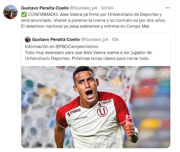 “Confirmado: Alex Valera ya firmó por Universitario de Deportes y será anunciado. Vuelve a ponerse la crema y su contrato es por dos años. El delantero nacional ya pasa exámenes y entren en Campo Mar”, publicó Gustavo Peralta en su cuenta de Twitter.
