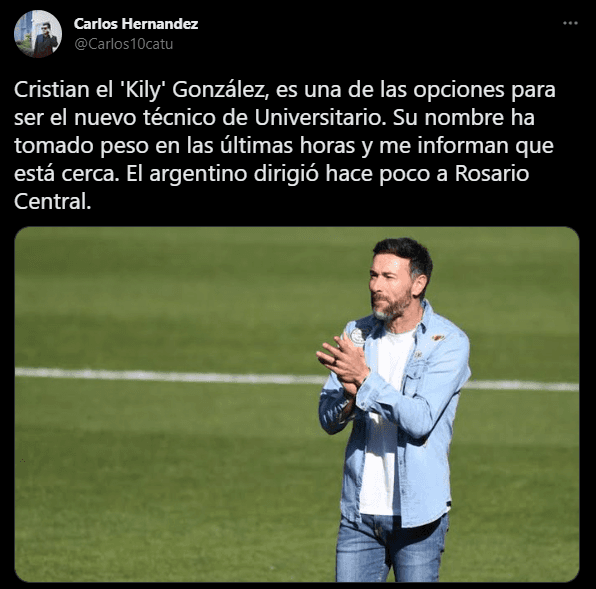 “Cristian el ‘Kily’ González, es una de las opciones para ser el nuevo técnico de Universitario. Su nombre ha tomado peso en las últimas horas y me informan que está cerca. El argentino dirigió hace poco a Rosario Central”. Con este dato, la caja de comentarios explotó, algunos a favor y otros en contra.