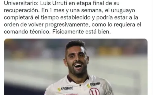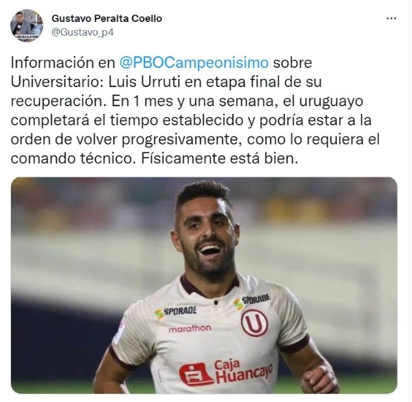 “Información en Campeonísimo sobre Universitario: Luis Urruti en etapa final de su recuperación. En 1 mes y una semana, el uruguayo completará el tiempo establecido y podría estar a la orden de volver progresivamente, como lo requiera el comando técnico. Físicamente está bien“, comentó Gustavo Peralta en su cuenta de Twitter.