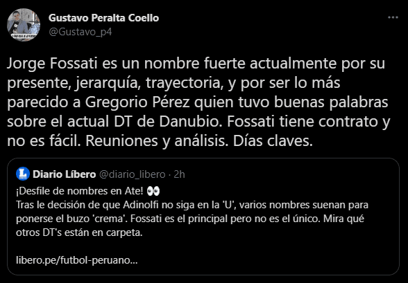 “Jorge Fossati es un nombre fuerte actualmente por su presente, jerarquía, trayectoria, y por ser lo más parecido a Gregorio Pérez quien tuvo buenas palabras sobre el actual DT de Danubio. Fossati tiene contrato y no es fácil. Reuniones y análisis. Días claves”. Dejando en claro que todo se va a definir pronto.