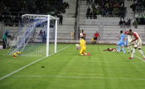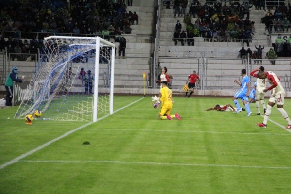 Los ‘cremas’ venían sosteniendo bien el encuentro, con individualidades de Piero Quispe y algunas buenas atajadas de Diego Romero. En el minuto 43 del compromiso, tras un centro al área de un jugador de Binacional, el defensa central, Nelinho Quina, desvió el balón queriendo despejar de cabeza que finalmente desacomodó al guardameta ‘merengue’ y el esférico terminó en la redes de los de Ate, poniendo el 1-0 para los celestes.