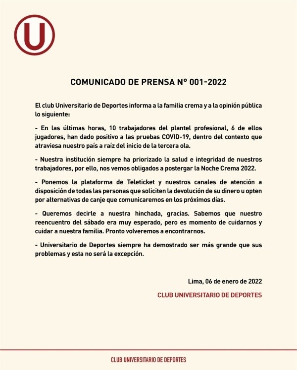 Lastimosamente, lo que se veía venir, se terminó confirmando. Los recientes casos de COVID-19 despertaron las alarmas en el plantel ‘merengue’, al punto de llevar a cabo un comunicado oficial donde se toman diversas decisiones. Universitario de Deportes mediante sus redes sociales sostuvo.
