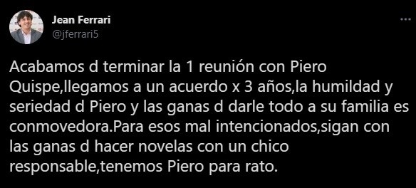 Jean Ferrari publicó este mensaje, y despertó a seguidor ‘estudiantil’: “Acabamos de terminar la primera reunión con Piero Quispe, llegamos a un acuerdo por 3 años, la humildad y seriedad de Piero y las ganas de darle todo a su familia es conmovedora. Para esos mal intencionados, sigan con las ganas de hacer novelas con un chico responsable, tenemos Piero para rato”.