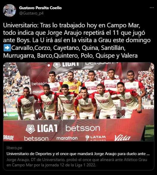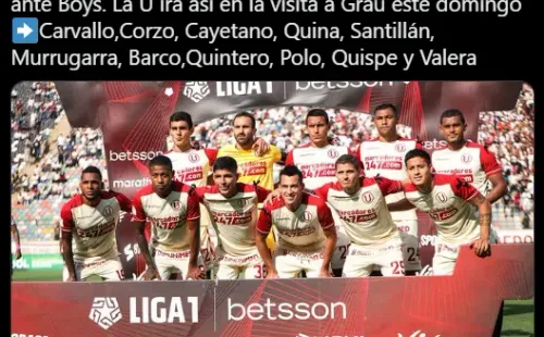 “Universitario: Tras lo trabajado hoy en Campo Mar, todo indica que Jorge Araujo repetirá el 11 que jugó ante Boys. La U irá así en la visita a Grau este domingo: Carvallo, Corzo, Cayetano, Quina, Santillán, Murrugarra, Barco, Quintero, Polo, Quispe y Valera”. Es lo que menciona el comunicador social en su cuenta de Twitter.