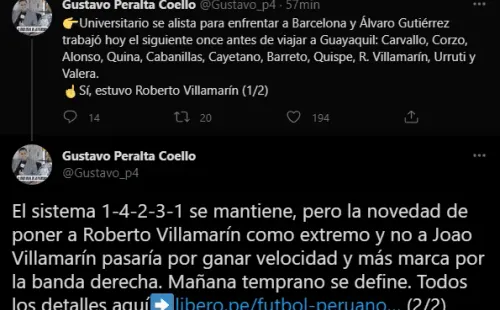 “Universitario se alista para enfrentar a Barcelona y Álvaro Gutiérrez trabajó hoy el siguiente once antes de viajar a Guayaquil: Carvallo, Corzo, Alonso, Quina, Cabanillas, Cayetano, Barreto, Quispe, R. Villamarín, Urruti y Valera”. Viendo un cambio en el once titular contra Carlos Stein.