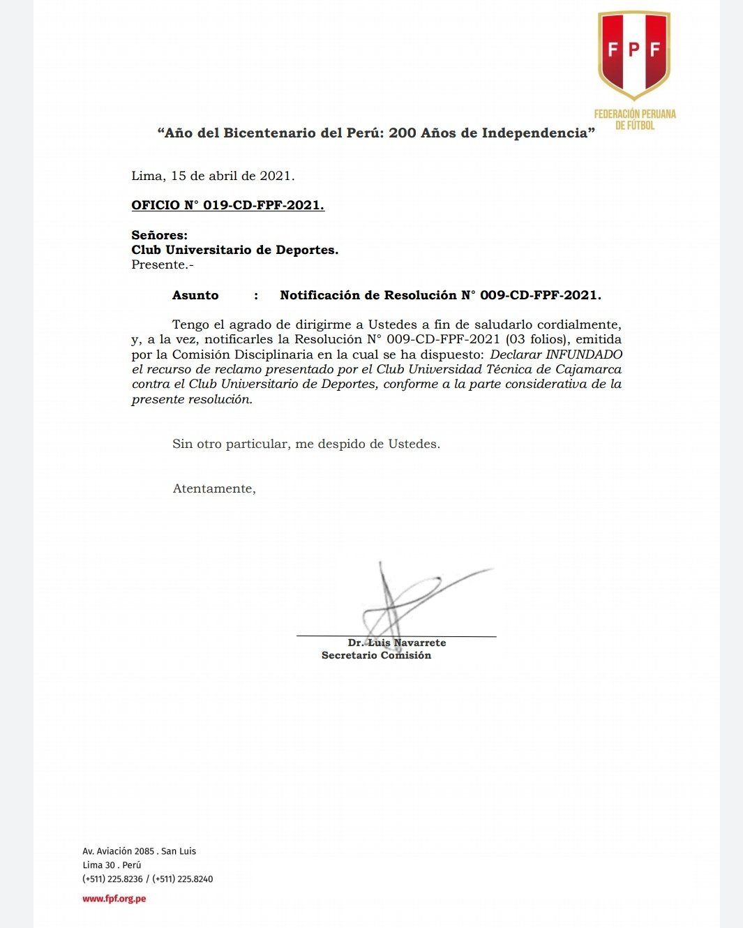 Mediante una comunicado, la FPF decidió infundar el reclamo presentado por UTC de Cajamarca, en el cual solicitaban el triunfo en mesa sobre Universitario por incumplimiento de protocolos sanitarios.