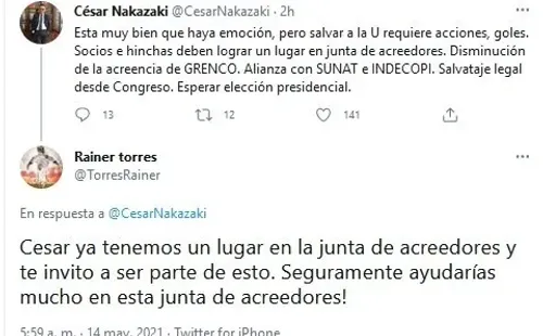 Entonces, Rainer le respondió en twitter: “Cesar ya tenemos un lugar en la junta de acreedores y te invito a ser parte de esto. Seguramente ayudarías mucho en esta junta de acreedores!”. “Rainer cómo estás? Muy buena noticia. Tu sabes de ubicación en la cancha para romper filas. Conversemos haber si ahora si puedo dejar de calentar y entro a la cancha”, le respondió Nakasaki.
