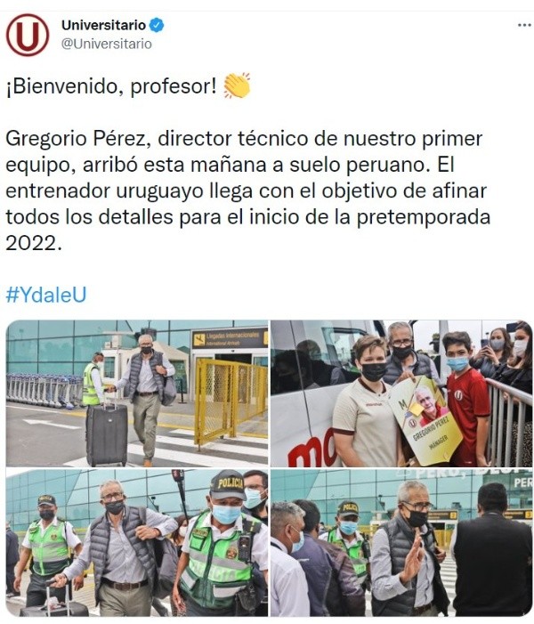 Gregorio Pérez llegó a Lima este sábado 4 de diciembre para volver a los trabajos con Universitario de Deportes, desde el 7 de este mes. El técnico ‘crema’ dio unas palabras sobre la llegada de Joao Villamarín, Alfonso Barco y también dijo que llegará un jugador más a tienda ‘merengue’ y será del extranjero.