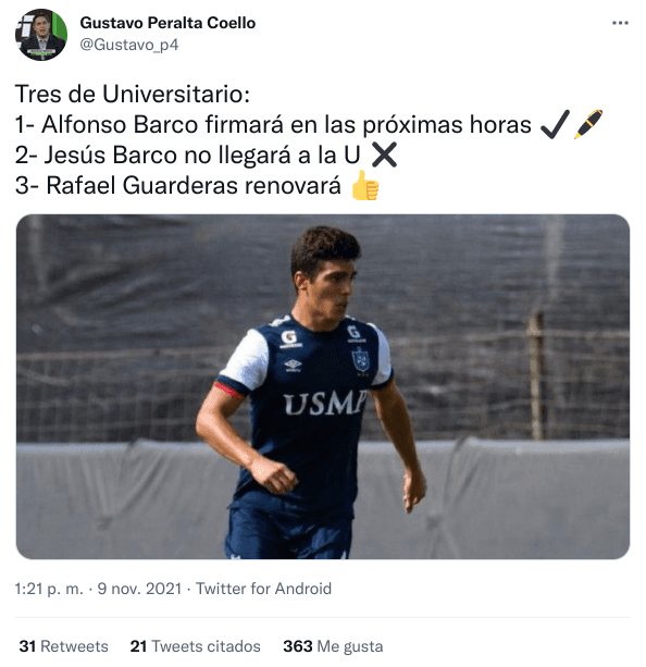 “Tres de Universitario: 1- Alfonso Barco firmará en las próximas horas 2- Jesús Barco no llegará a la U 3- Rafael Guarderas renovará”, escribió el mencionado comunicador de Líbero. Así, quien se desempeña como volante defensivo, se pondrá la Crema y podrá luchar por un puesto en Ate.